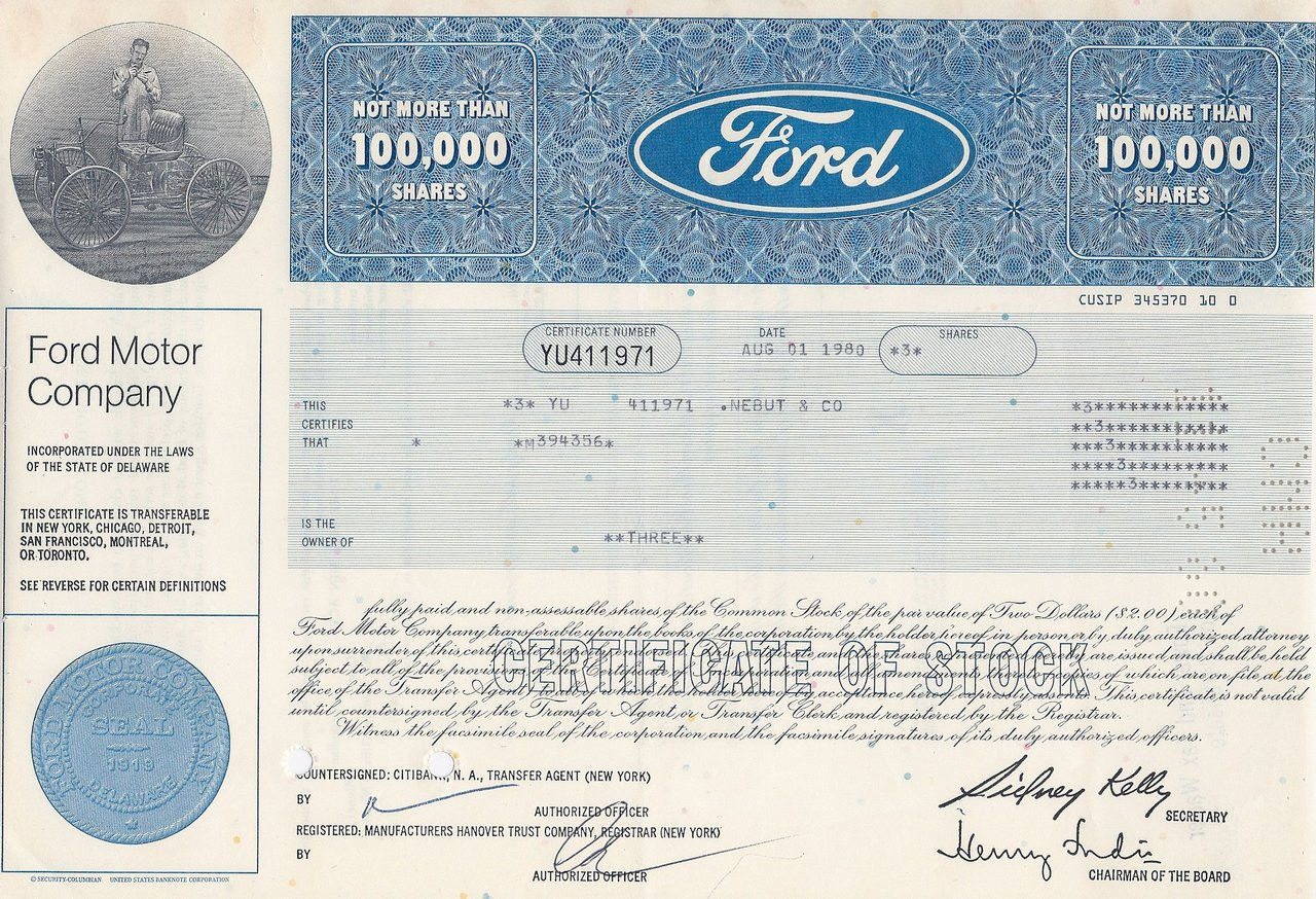 Ford Motor Company unissued stock certificate
